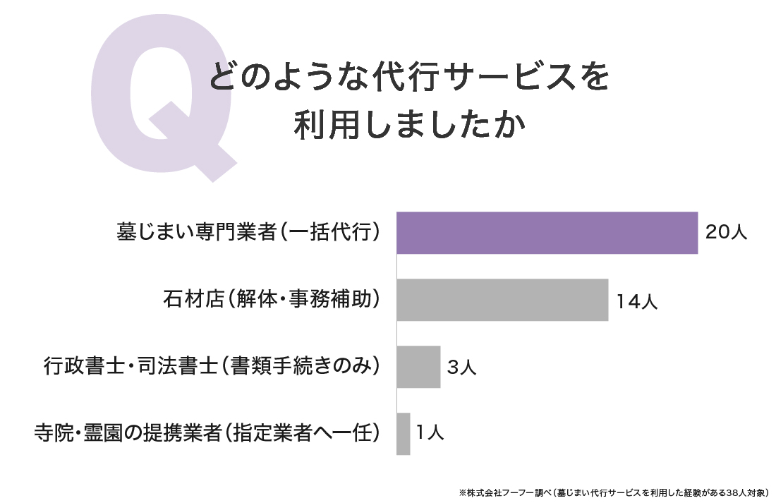 「墓じまい代行サービスを利用した経験がある38人」に、利用した業者の種類を尋ねたところ、以下のような結果になりました。